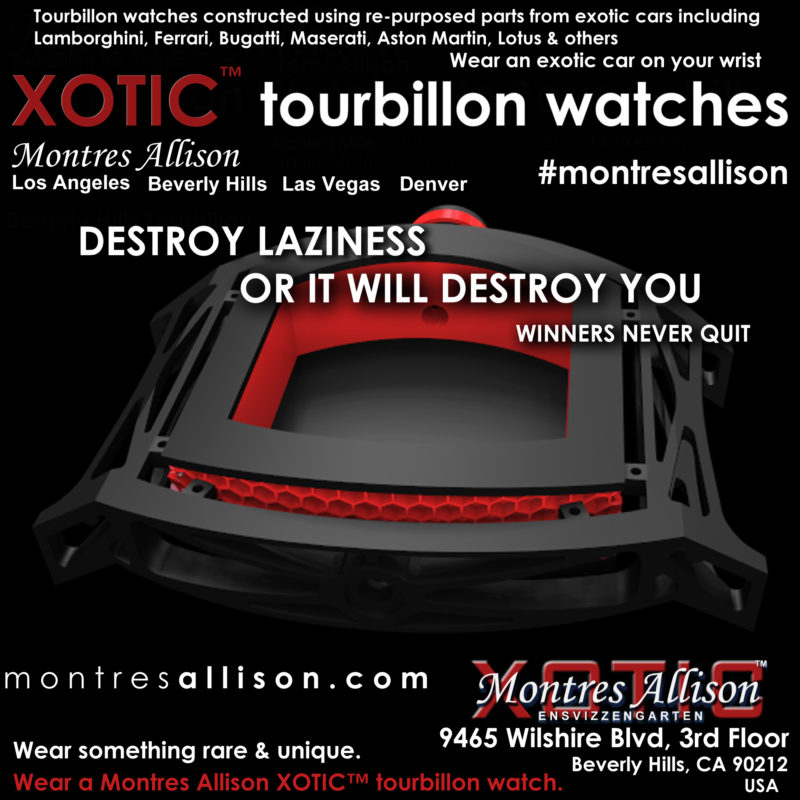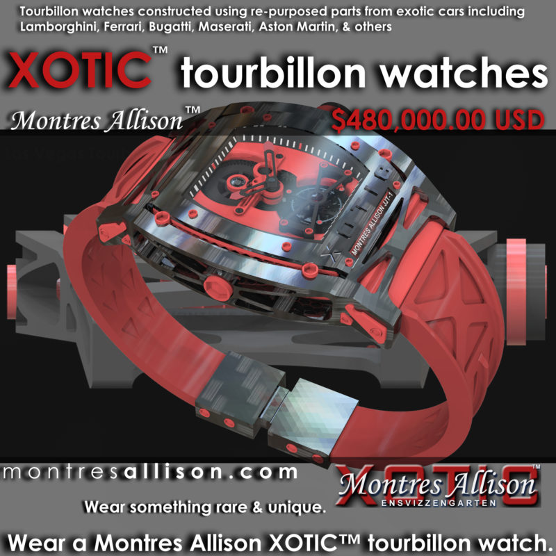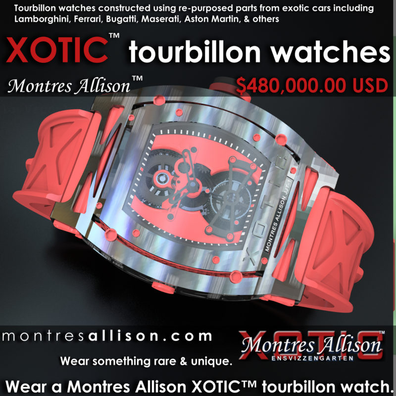USING RE-PURPOSED PARTS FROM LAMBORGHINI, FERRARI, ASTON MARTIN, BENTLEY, MASERATI, BUGATTI, & OTHER EXOTIC CARS TO BUILD WATCH COMPONENTS IN THE XOTIC™ MONTRES ALLISON™ WATCHES SINCE 2018